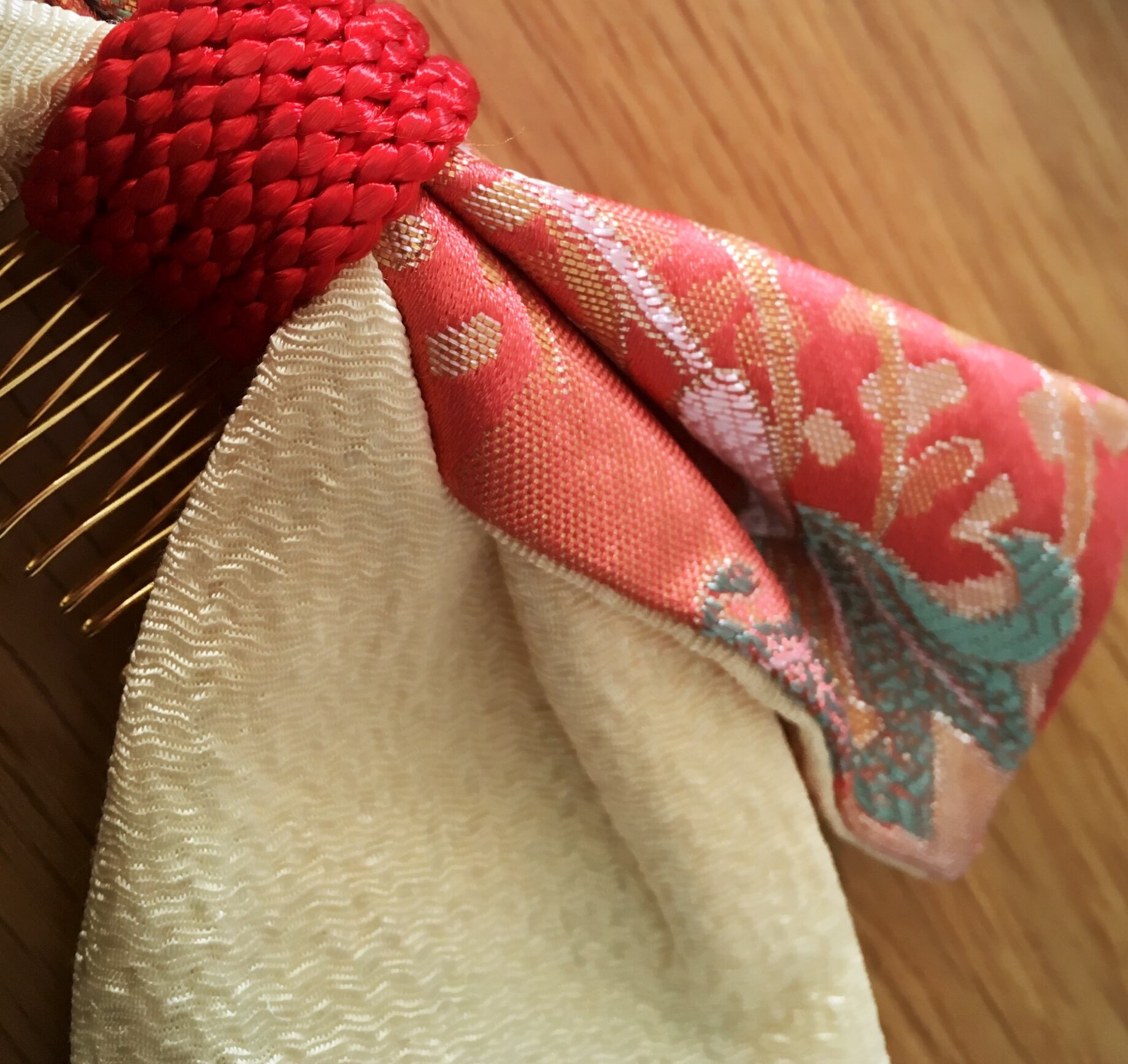 金襴生地に組紐をあしらったリボンの髪飾り。