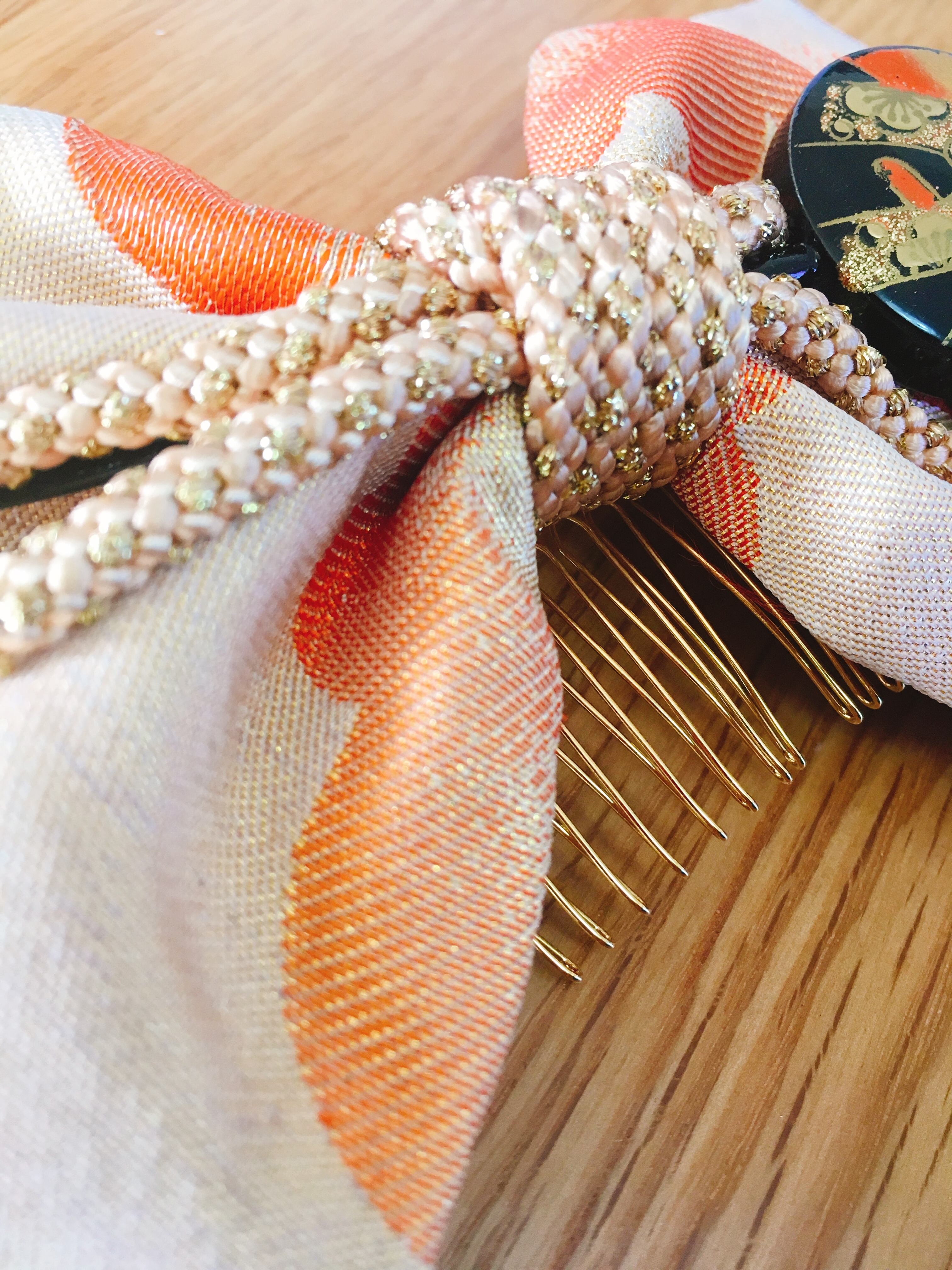 金襴の生地とゴールドの組紐を合わせた華やかなリボンの髪飾り。